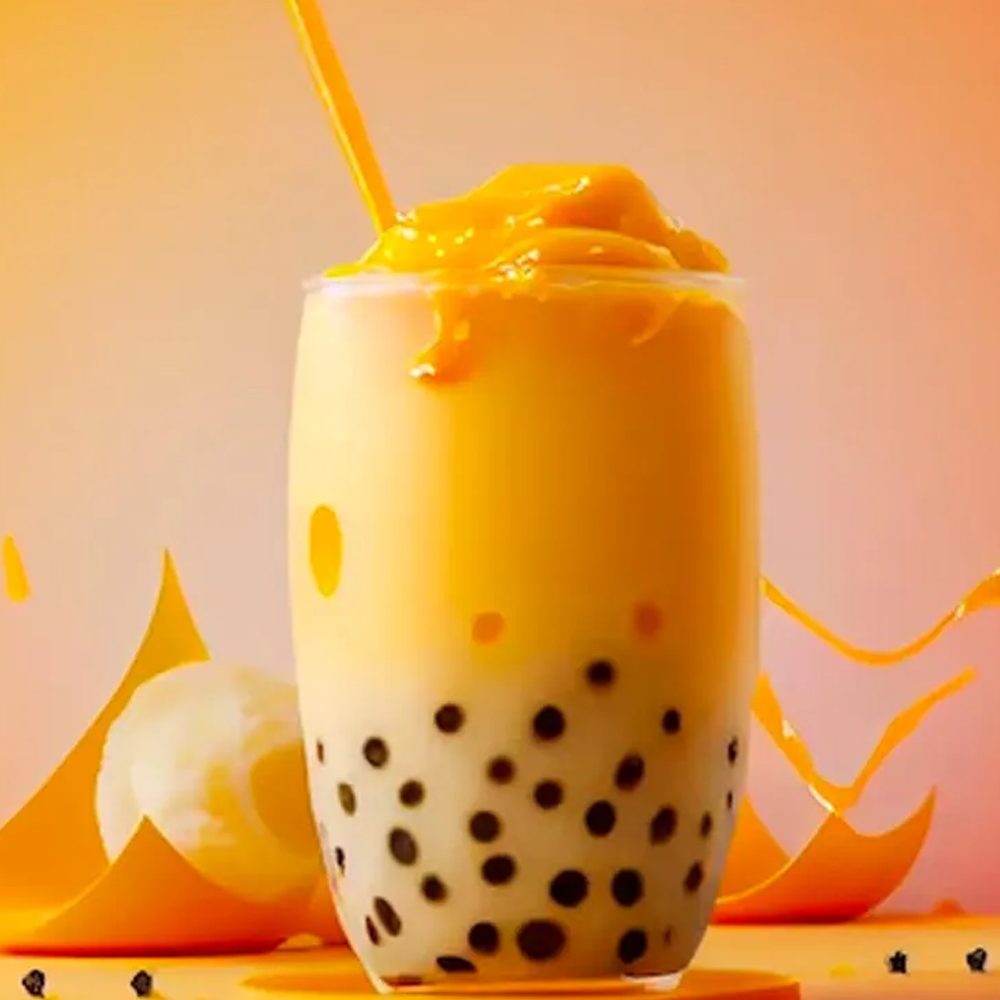 Tropical and fruity mango-flavoured milk tea with chewy tapioca pearls — refreshing and delightfully sweet. Served chilled.