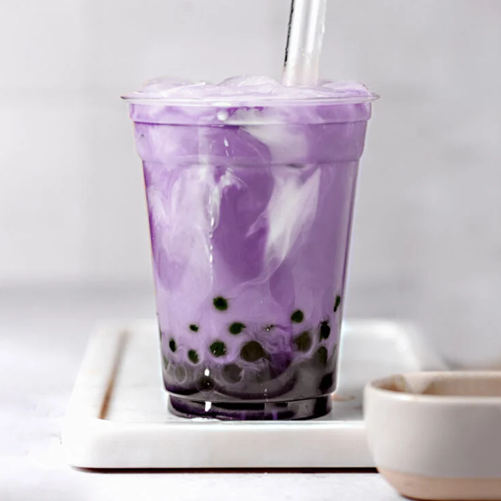 Creamy and subtly sweet taro-flavored milk tea with chewy tapioca pearls. Served chilled in a small cup.