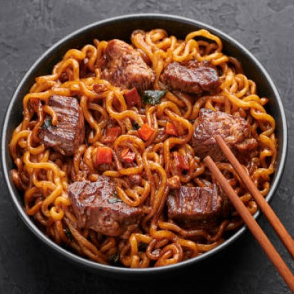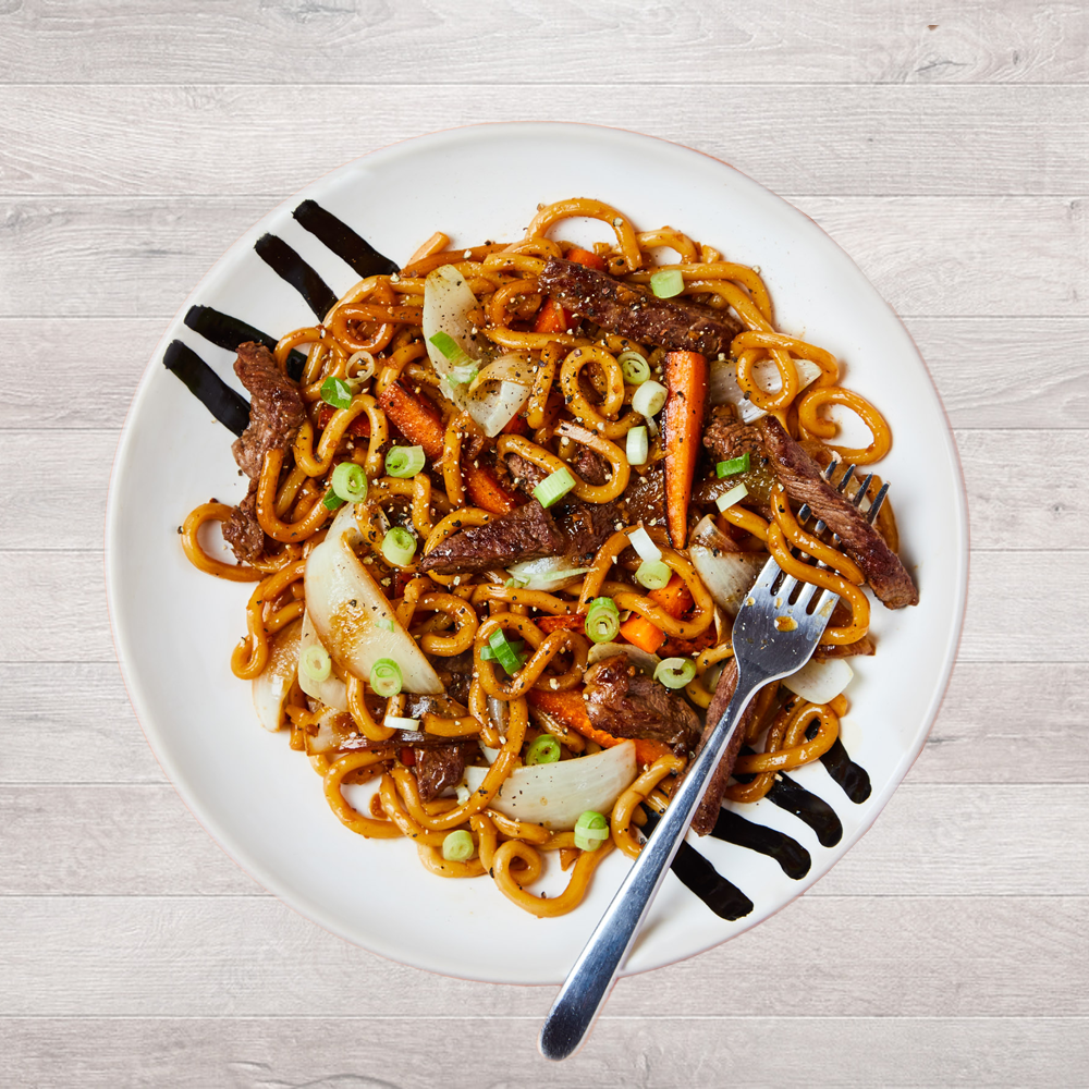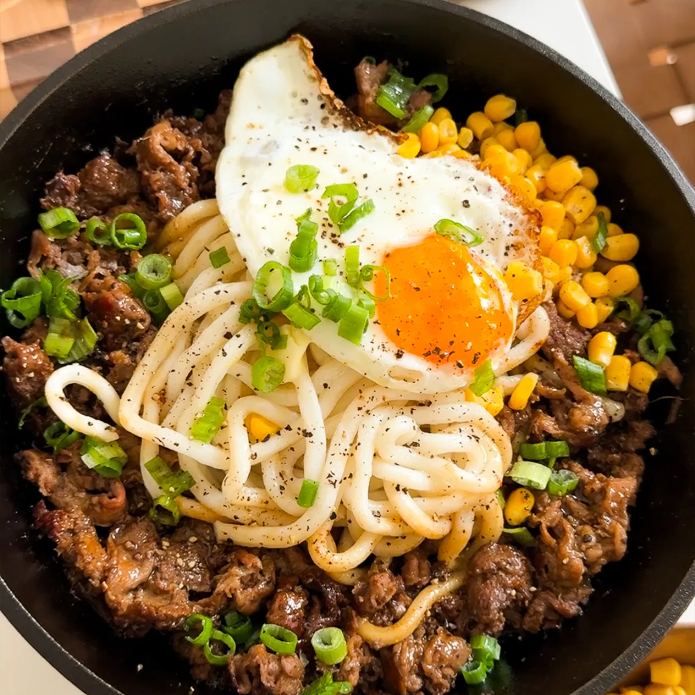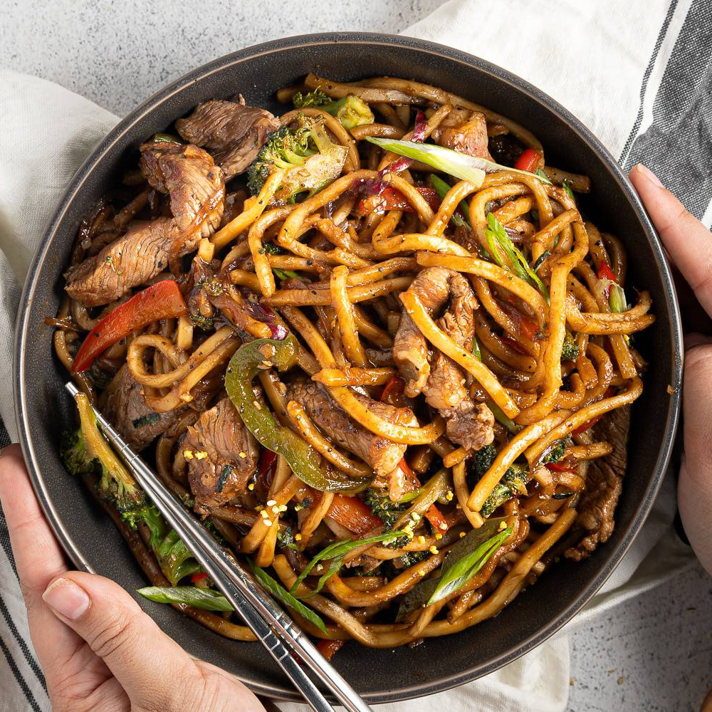 Thick udon noodles stir-fried with tender beef slices, crisp vegetables, and a bold black pepper sauce — smoky, hearty, and full of umami flavour.