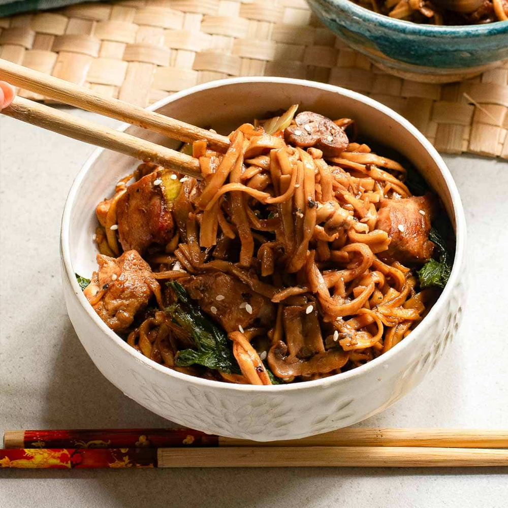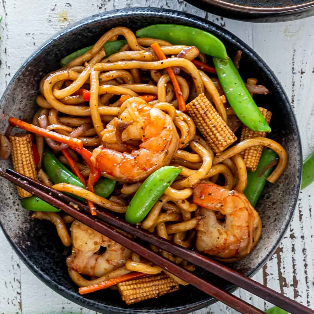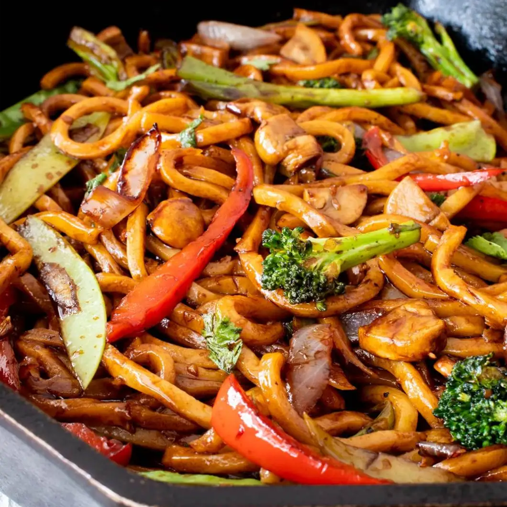 Thick udon noodles stir-fried with tender chicken, crisp vegetables, and a punchy black pepper sauce — smoky, savory, and irresistibly satisfying.
