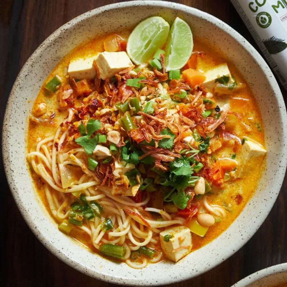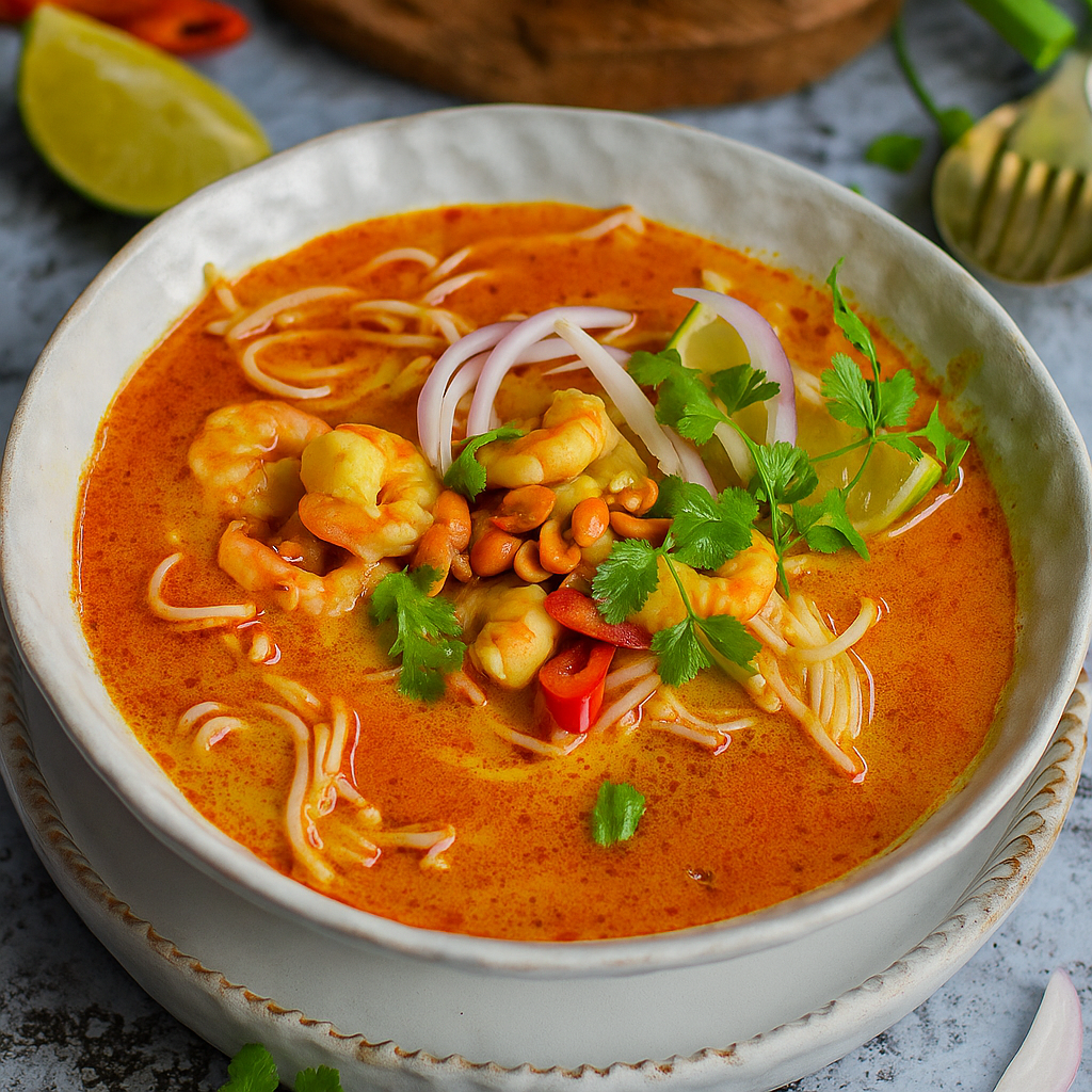 Creamy coconut noodle soup topped with tender prawns, crunchy toppings, and a squeeze of lime. Rich, aromatic, and comforting.