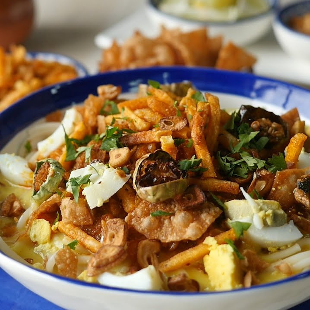 Slow-cooked beef in a fragrant coconut curry, served over noodles and topped with crispy garnishes — a bold and hearty Burmese favourite!