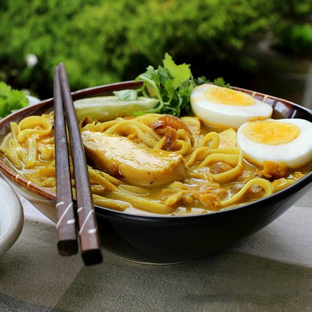 A comforting bowl of coconut curry noodles topped with crispy noodles, fresh herbs, and your choice of protein — rich, creamy, and bursting with Burmese flavours!
