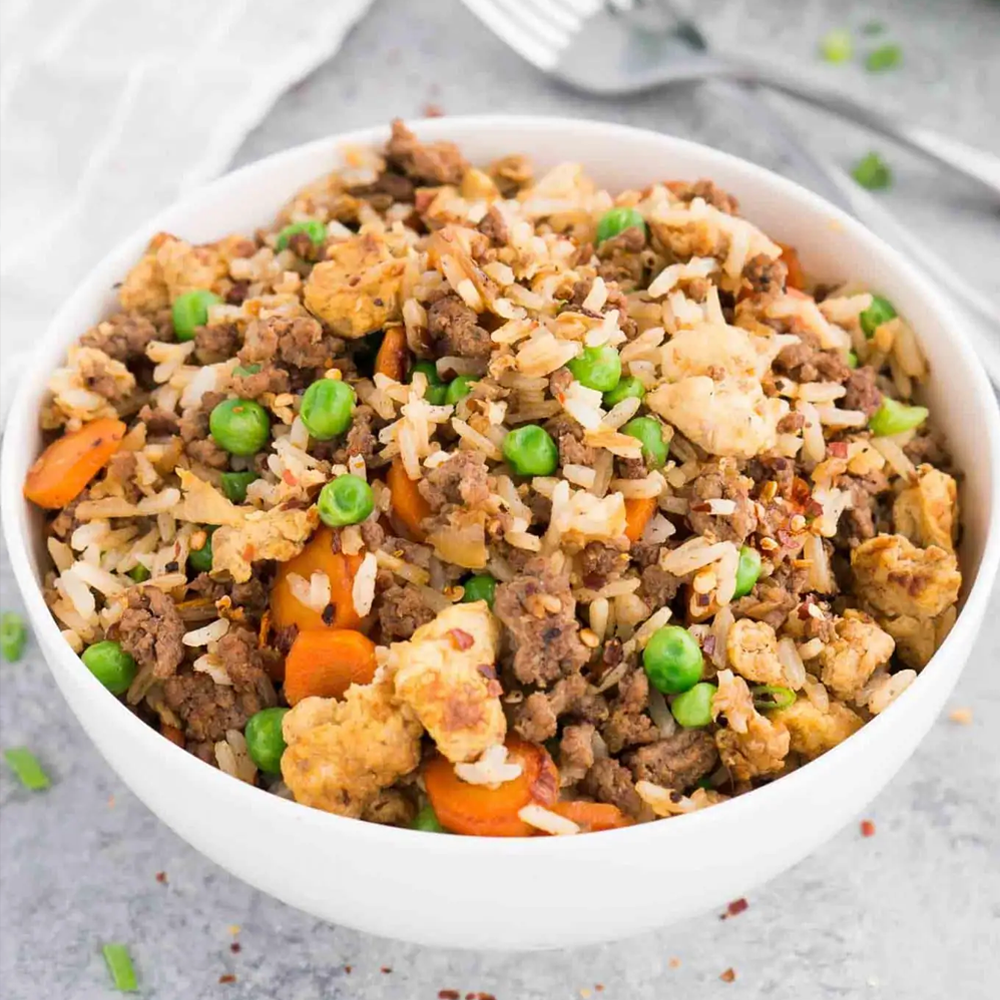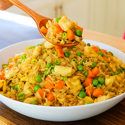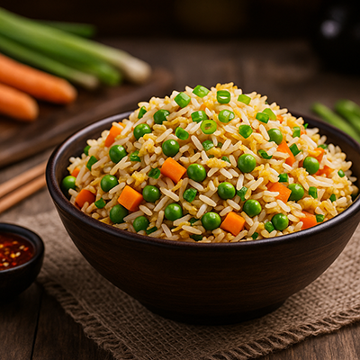 Fragrant stir-fried rice cooked with tender chicken pieces, eggs, and mixed vegetables—seasoned to perfection for a hearty and satisfying meal.