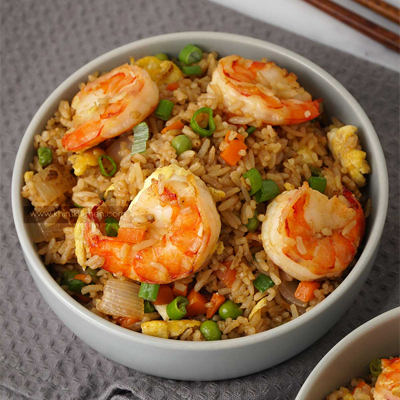 Wok-tossed rice with juicy prawns, mixed veggies, and savoury seasonings for a flavourful, satisfying meal.