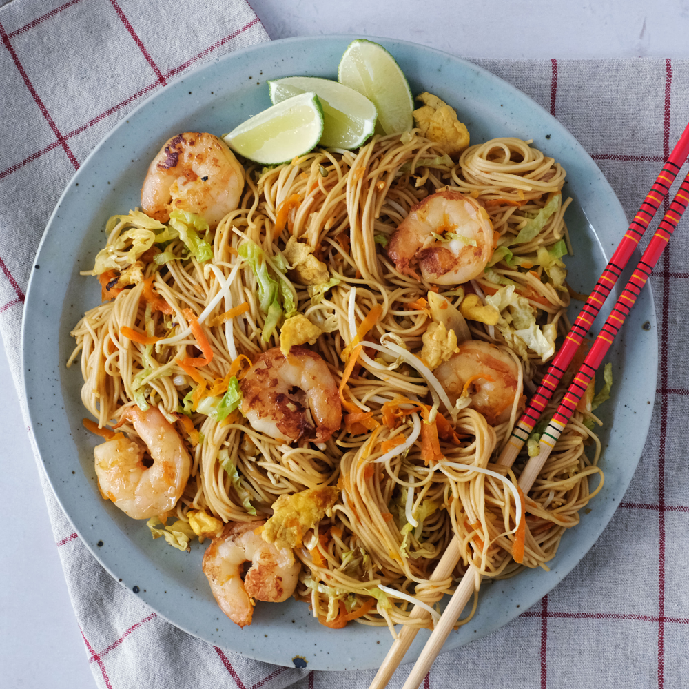 Stir-fried noodles with juicy prawns, veggies, and a savoury soy sauce blend. A delicious Indonesian favourite!