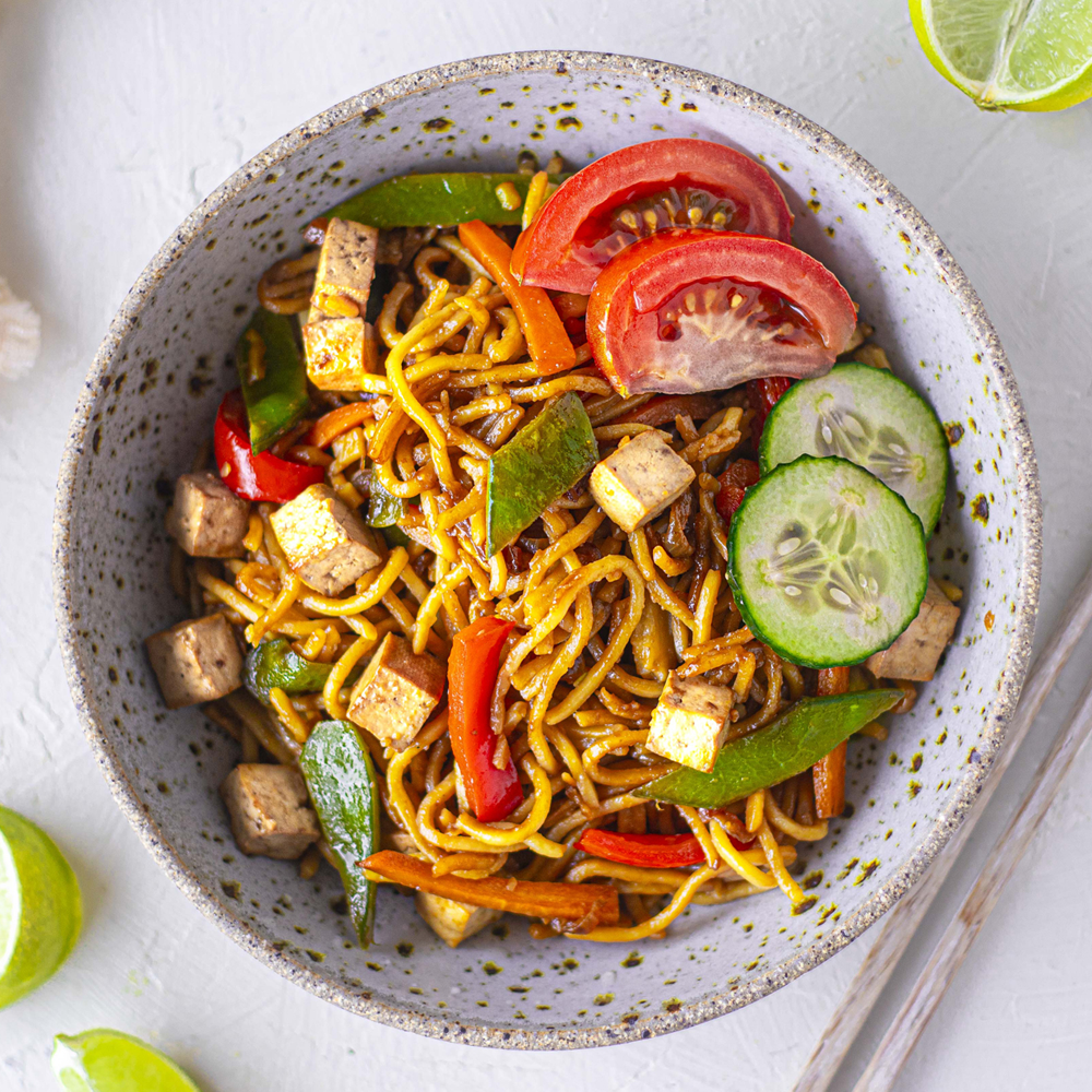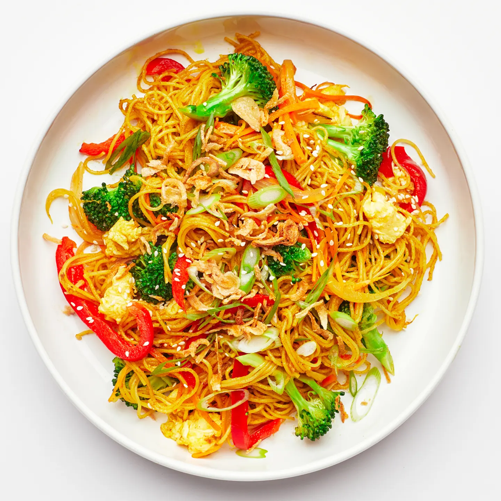 Thin rice noodles stir-fried with egg, mixed vegetables, and aromatic curry spices — light, spicy, and full of flavour.