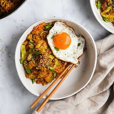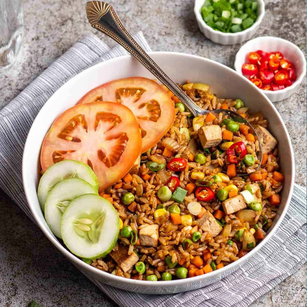 A flavourful vegetarian take on the classic Indonesian fried rice, wok-tossed with fresh vegetables, aromatic spices, and sweet soy sauce, topped with a fried egg.