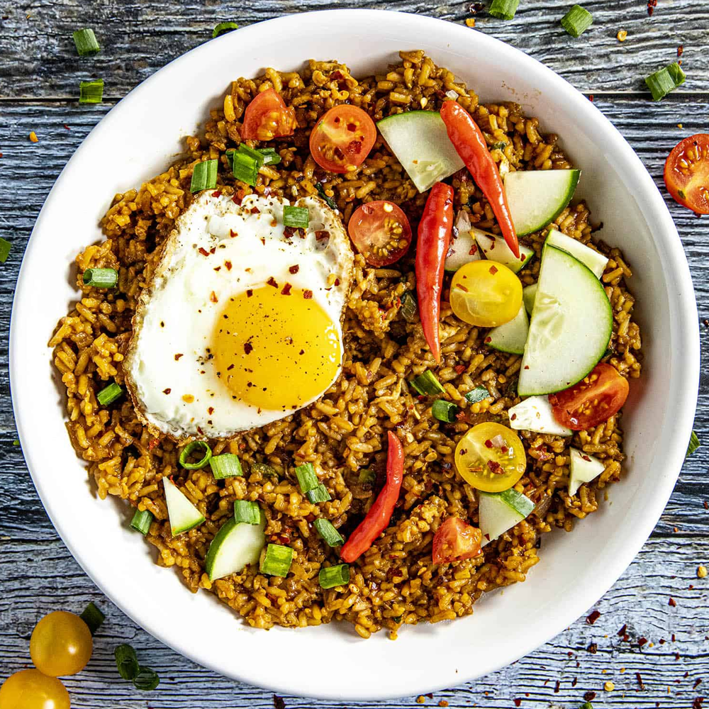 Traditional Indonesian fried rice cooked with rich spices and sweet soy sauce, served with a perfectly fried egg on top for that authentic street food flavour.