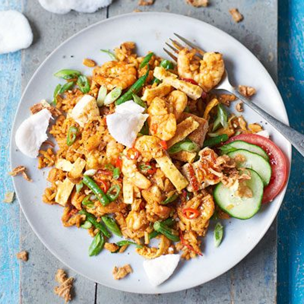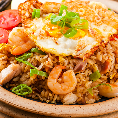 A bold and aromatic Indonesian fried rice cooked with juicy prawns, sweet soy sauce, chili, and traditional spices, topped with a fried egg for that authentic finish.