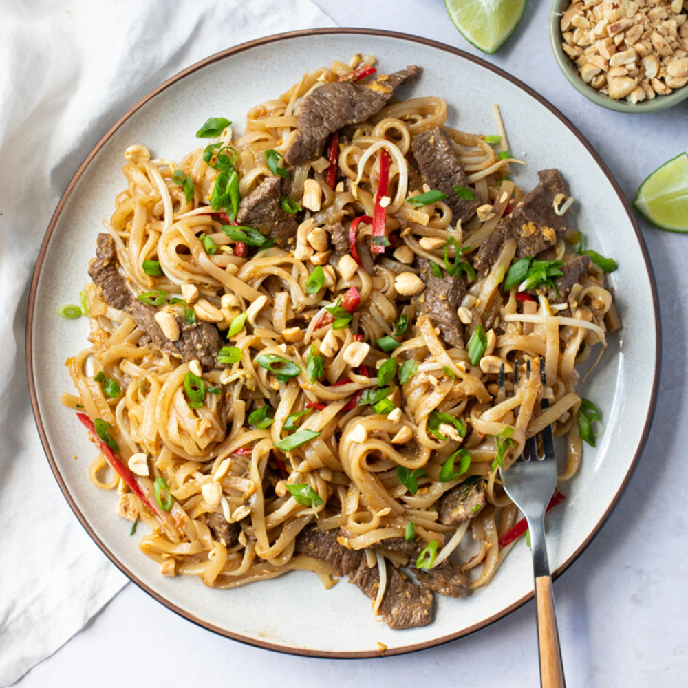 Tender beef stir-fried with rice noodles, egg, peanuts, and bean sprouts in a rich, tangy tamarind sauce — bold Thai flavours in every bite!