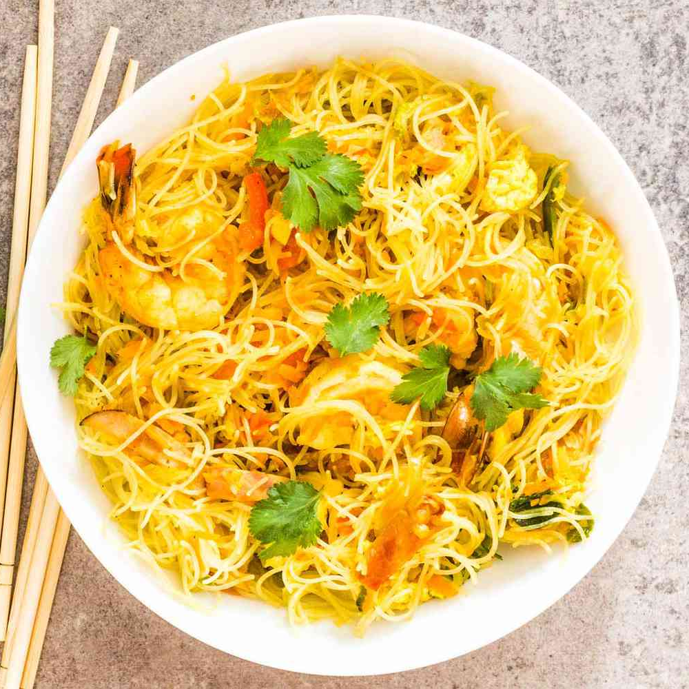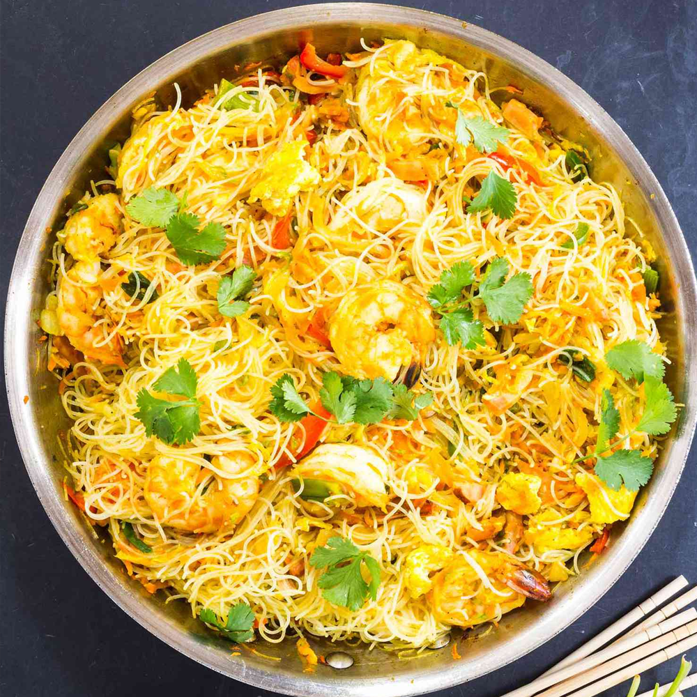 Thin rice noodles wok-tossed with juicy prawns, crisp veggies, and aromatic curry spices — light, spicy, and bursting with flavour.