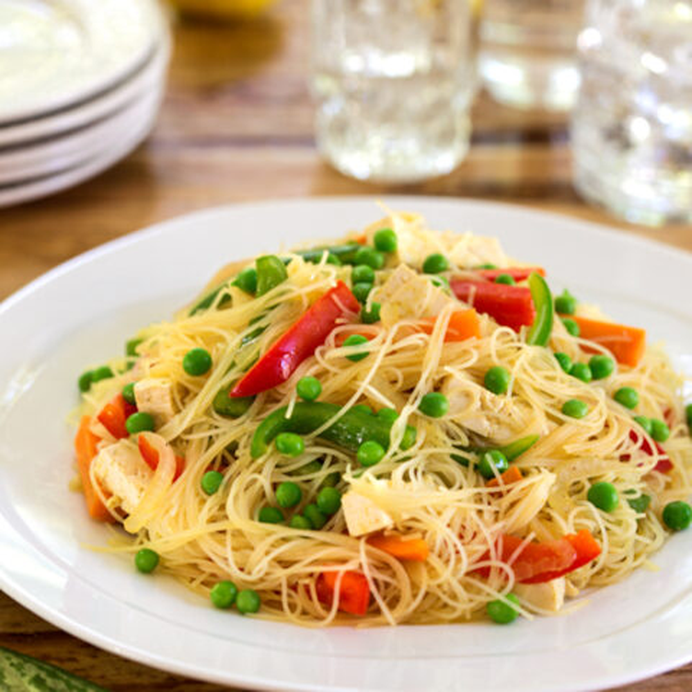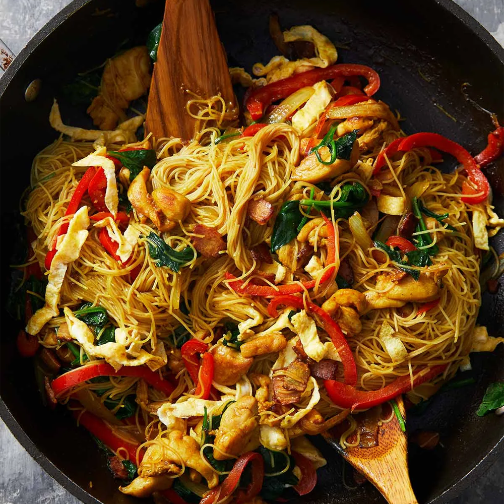 Thin rice noodles stir-fried with tender chicken, veggies, and bold curry spices — aromatic, spicy, and satisfying.