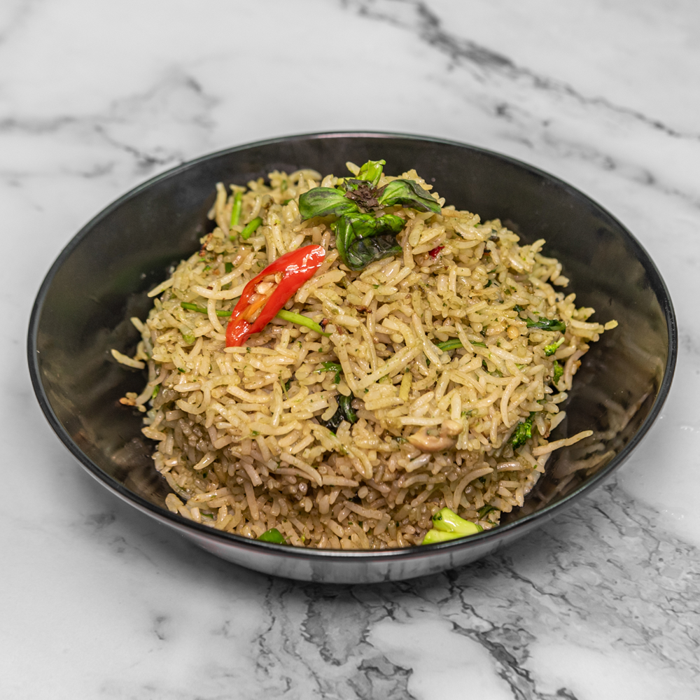 Fragrant jasmine rice stir-fried with fresh Thai basil, chili, garlic, and vegetables — a spicy and aromatic favourite bursting with bold flavours.