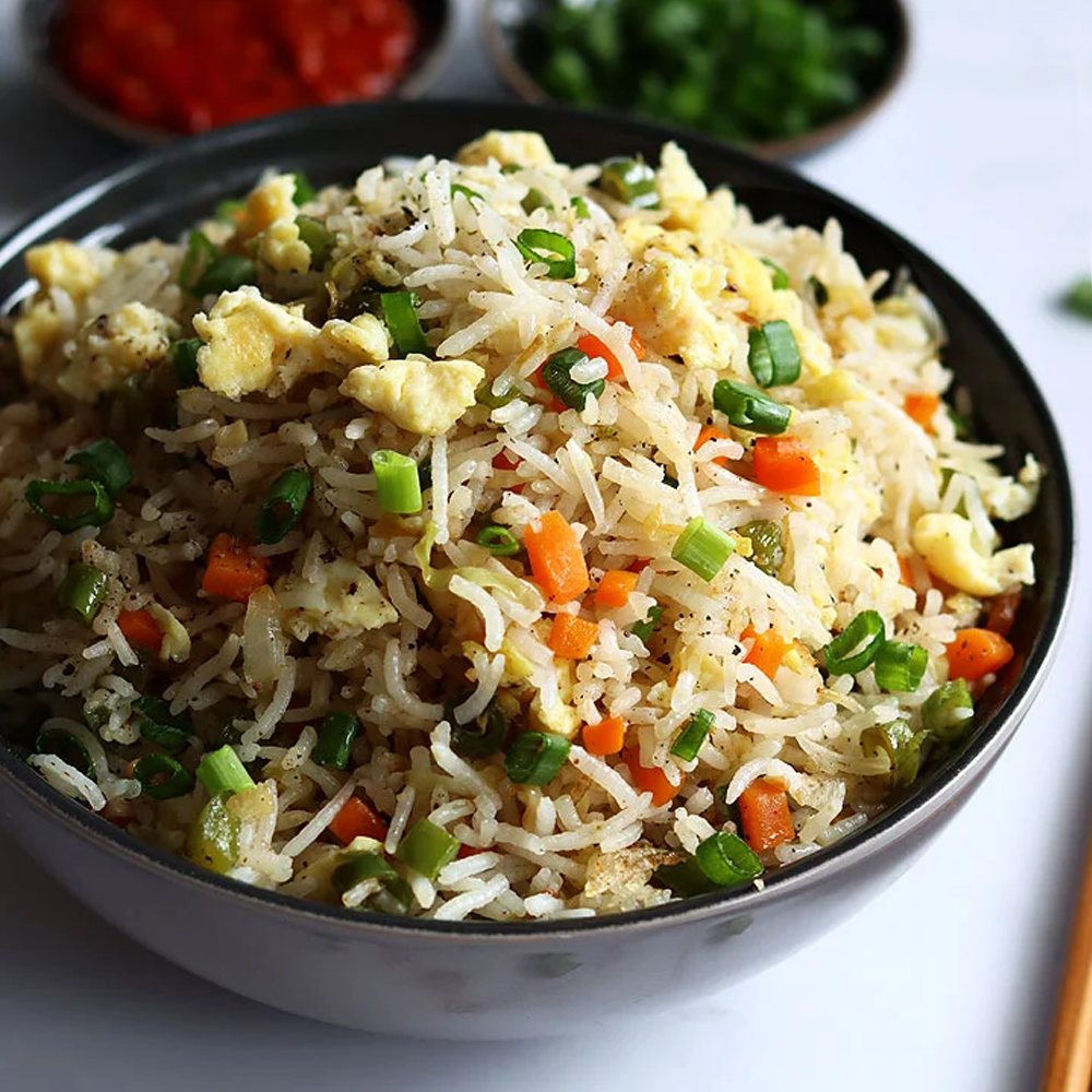 A colourful mix of fresh vegetables stir-fried with rice, garlic, and soy sauce—light, aromatic, and full of wok-kissed flavour. A perfect vegetarian delight.